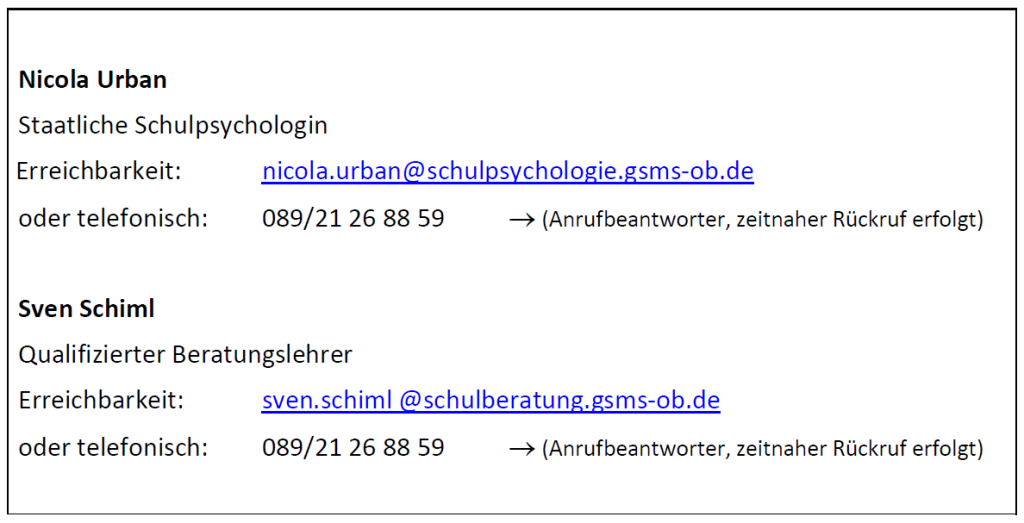 • Staatliche Schulberatungsstelle, Infanteriestr. 7 Tel.: 089 558998960